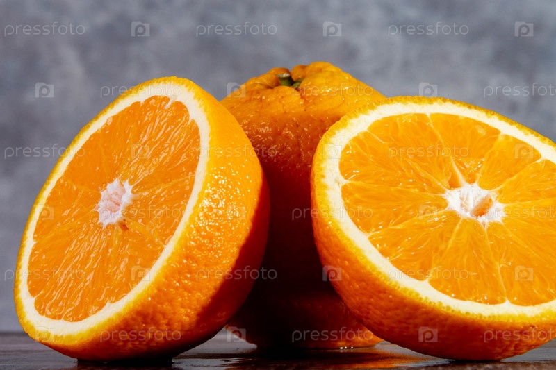 Целый апельсин и разрезанная половина. Оранжевые фрукты на бетонном фоне текстуры