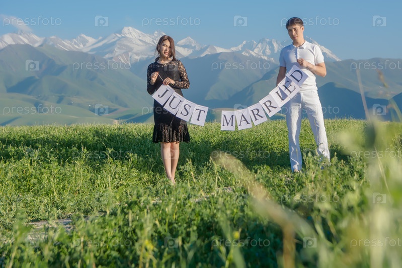 Парень и девушка азиатской национальности киргизы на природе, на фоне гор. держат табличку, баннер молодожены, молодожены