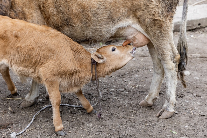 Грузия. Сенаки. Сельскохозяйственные животные - корова кормит теленка. Джорджия. Сенеки. Фермерские животные - корова питает телёнка