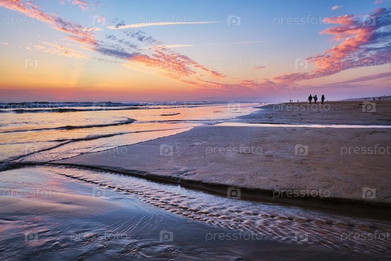 Атлантический океан после захода солнца с бушующими волнами на пляже Фонте-да-Телья, Коста-да-Капарика, Португалия