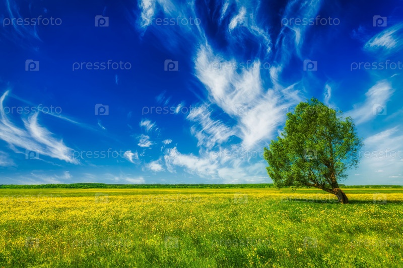 Весенний летний пейзаж зеленого поля с одним деревом