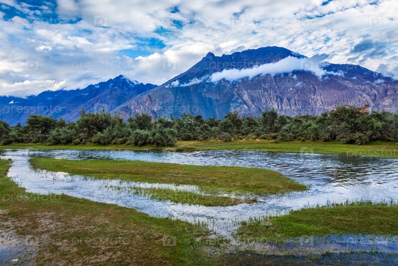Панорама Гималаев и пейзаж долины Нубра на закате. Хунбер, долина Нубра, Ладакх, Индия