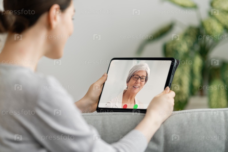 Женщина использует планшетный компьютер для удаленного разговора с друзьями