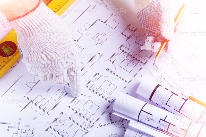 Руки строителя на фоне плана дома. Планирование строительства. Составление сметы