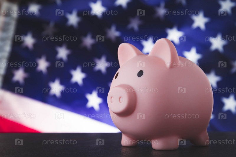 Накопление денег в США. Копилка и флаг Америки