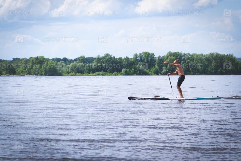 Мужчины и друзья катаются на досках SUP по большой реке во время восхода солнца
