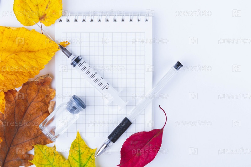 Вакцина и шприц лежат на столе рядом с блокнотом врача и осенними листьями. Пустой блокнот для записей в кабинете врача. Осенняя вакцинация