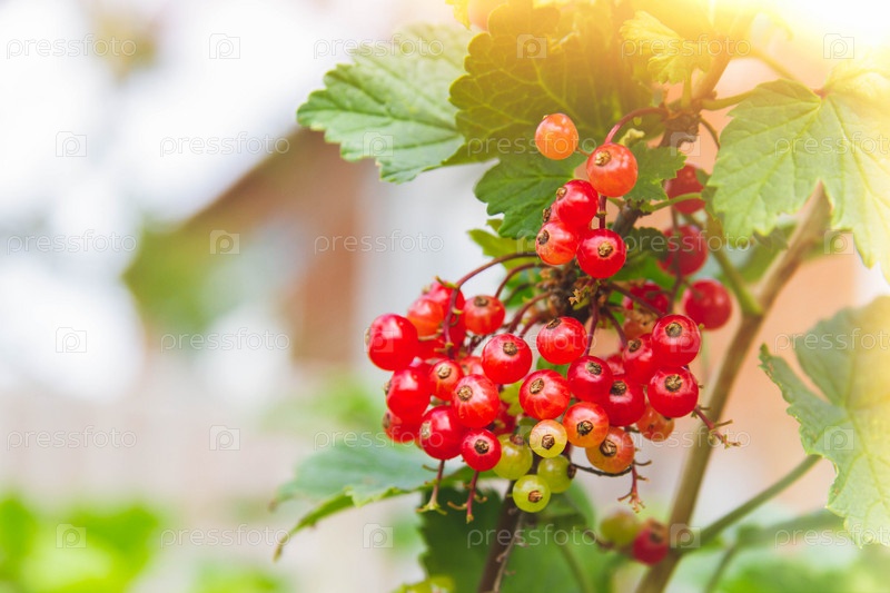 Красная смородина в лучах яркого солнца. Спелые ягоды, выращенные без ГМО
