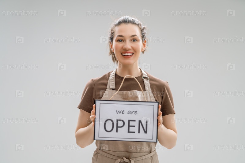 Владелец бизнеса держит табличку о возобновлении работы