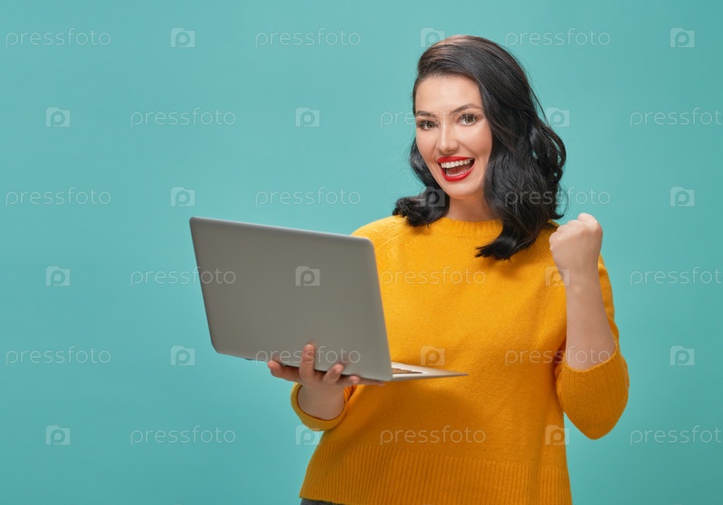 Женщина с ноутбуком на бирюзовом фоне