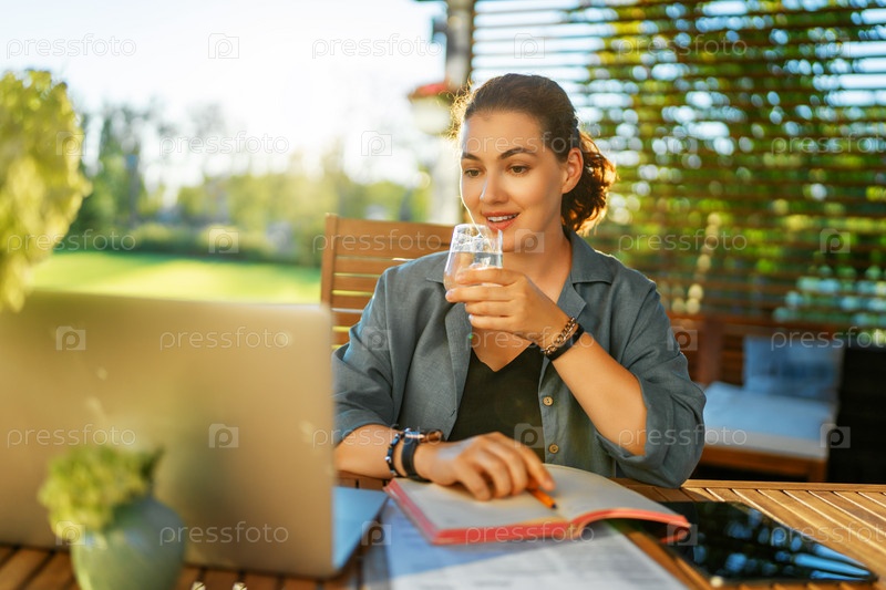 Женщина работает, сидя во внутреннем дворике