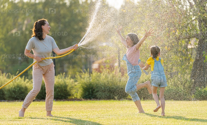 Счастливая семья играет на заднем дворе