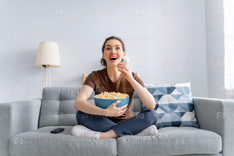 Молодая женщина смотрит телевизор