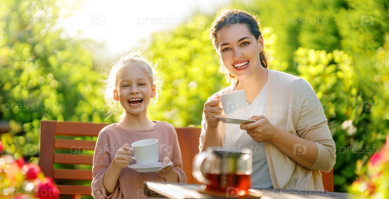 Семья пьет чай в саду