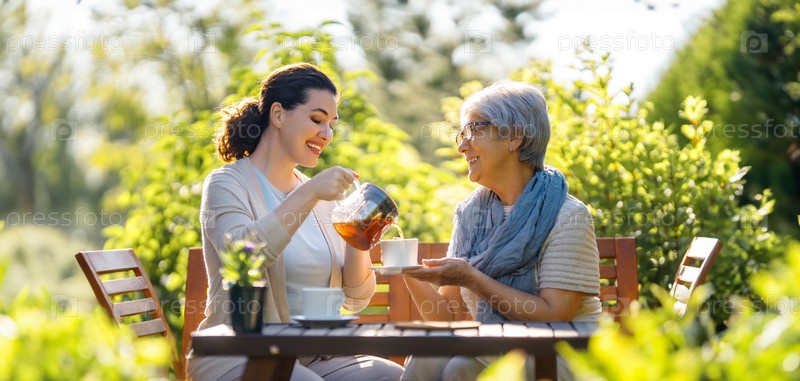 Женщины пьют чай в саду