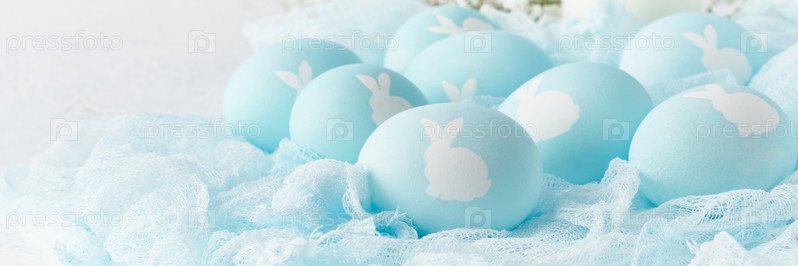 Пасхальное знамя. Праздничный день. Светлый белый фон, нежные пастельные тона. Голубые яйца с изображением кролика в корзине. Цветы на заднем плане