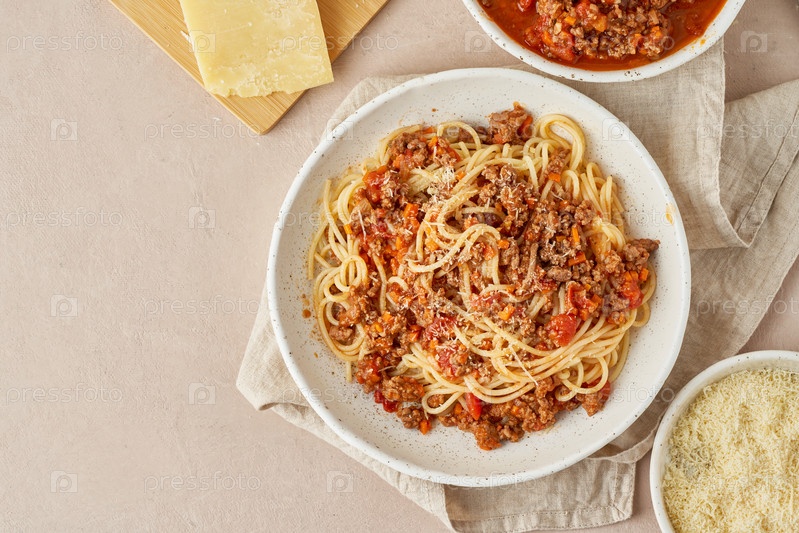 Паста Болоньезе со спагетти, мясным фаршем и помидорами, сыром пармезан. Итальянская кухня, терракотовый фон. Домашние свежие продукты. Вид сверху, пространство для копирования