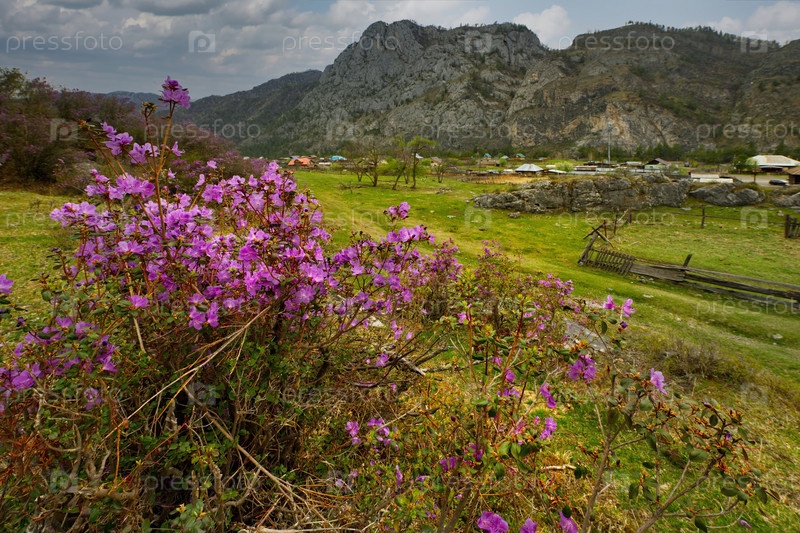 Россия. Горный Алтай. Тысячи туристов из разных стран в начале мая приезжают полюбоваться цветением рододендрона ледебура на скалистых склонах высоких гор вдоль Чуйского тракта