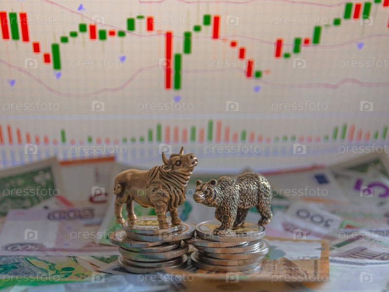 Бронзовые фигуры быка и медведя возле металлических монет на фоне бумажных денег и диаграмм. Размытие фона и перспективы. Концепция и символ фондовой биржи и торговли акциями