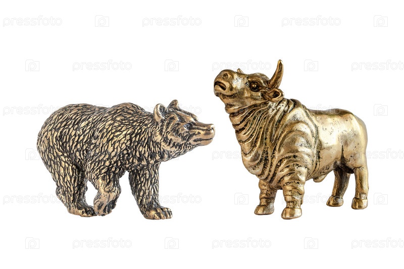 Изолированное изображение фигурок желтого металлического быка и медведя. Понятие о символе биржевой торговли, взаимодействие покупателей и продавцов. Серия изображений