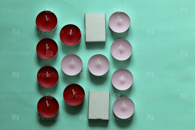 Декоративные свечи и спичечные коробки, расположенные в ряд. На мятном фоне