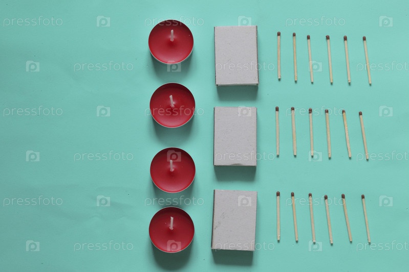 Декоративные свечи, спичечные коробки и спички расположены в ряд. На мятном фоне