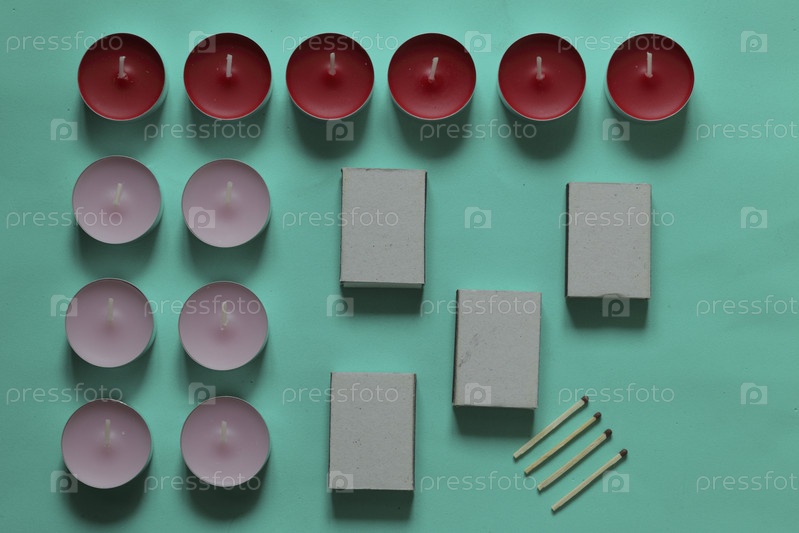Декоративные свечи, спичечные коробки и спички расположены в ряд. На мятном фоне