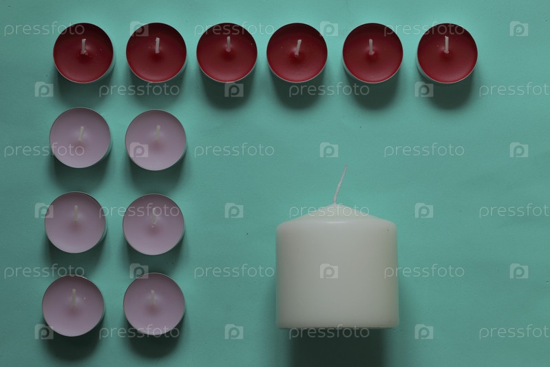 Декоративные свечи, расположенные в ряд. На мятном фоне