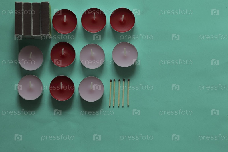 Декоративные свечи, спичечные коробки и спички расположены в ряд. На мятном фоне