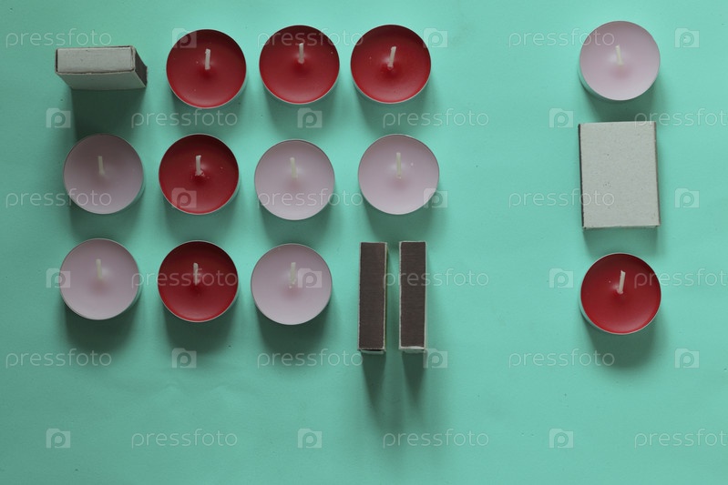 Декоративные свечи и спичечные коробки, расположенные в ряд. На мятном фоне