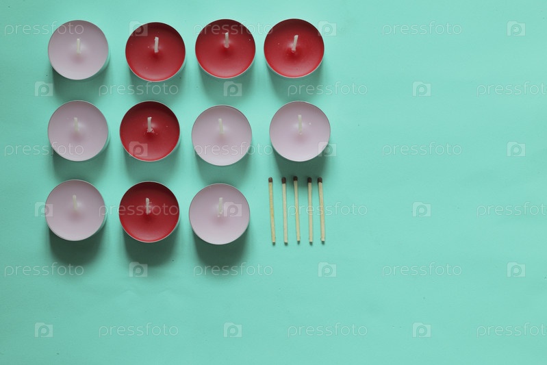 Декоративные свечи и спички расположены в ряд. На мятном фоне