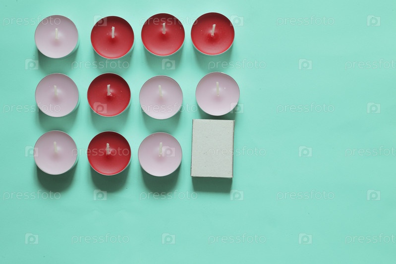 Декоративные свечи и спичечные коробки, расположенные в ряд. На мятном фоне