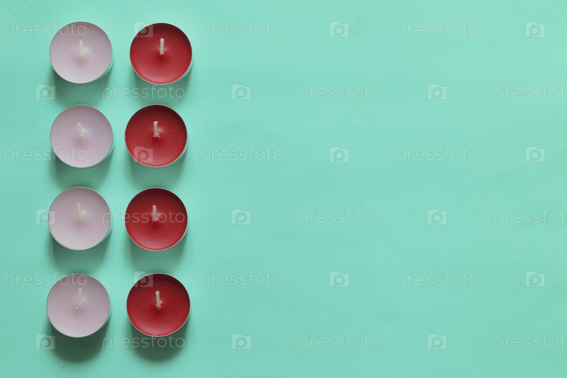 Декоративные свечи, расположенные в ряд. На мятном фоне