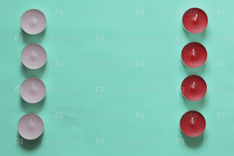 Декоративные свечи, расположенные в ряд. На мятном фоне