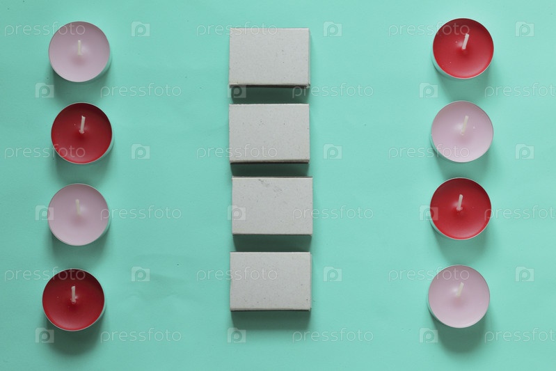 Декоративные свечи и спичечные коробки, расположенные в ряд. На мятном фоне