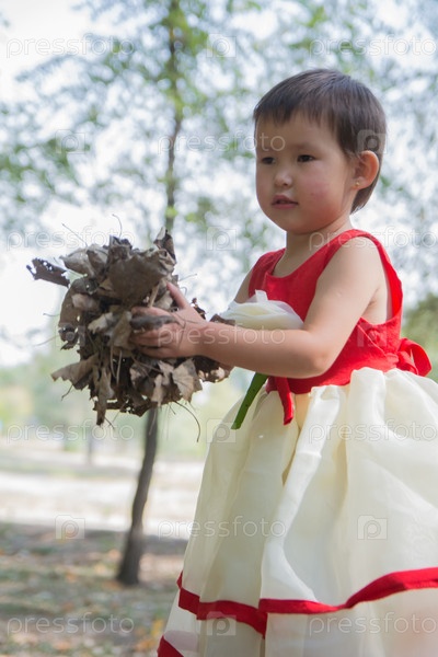 5-летняя девочка весной играет с листьями в парке