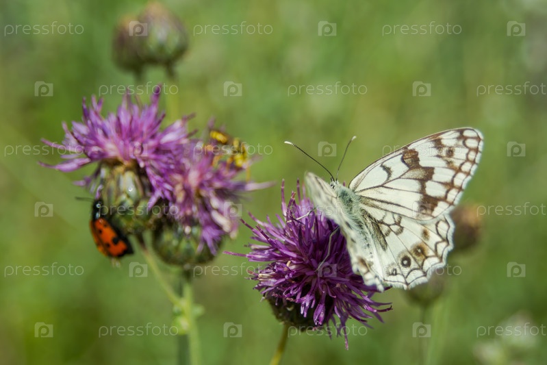 Бабочка собирает пыльцу с цветов в природе