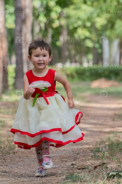 5-летняя девочка весной бежит по лесной тропинке между елями