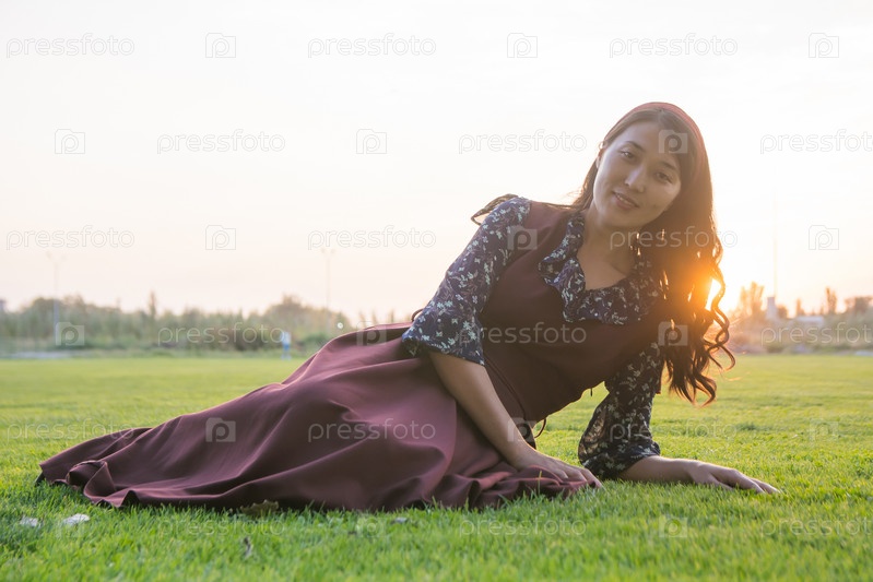 Молодая девушка азиатской национальности гуляет весной по природе среди деревьев