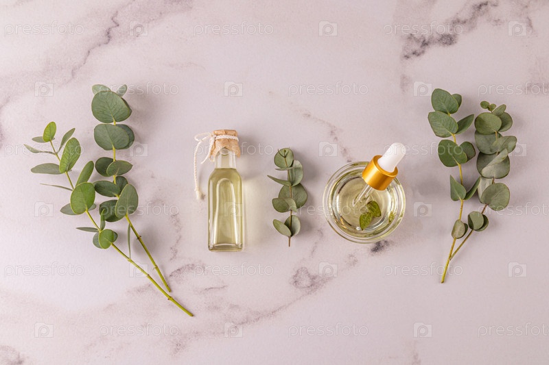 Бутылка и миска с пипеткой натурального органического эвкалиптового масла на белом мраморном фоне с ветвями эвкалипта. Верхний вид. Санаторно-курортное лечение