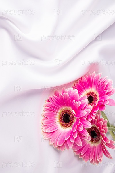 Вертикальный праздничный фон из белой атласной ткани с мягкими волнами и яркими розовыми герберами. Копировальное пространство. открытка, обои, обложка