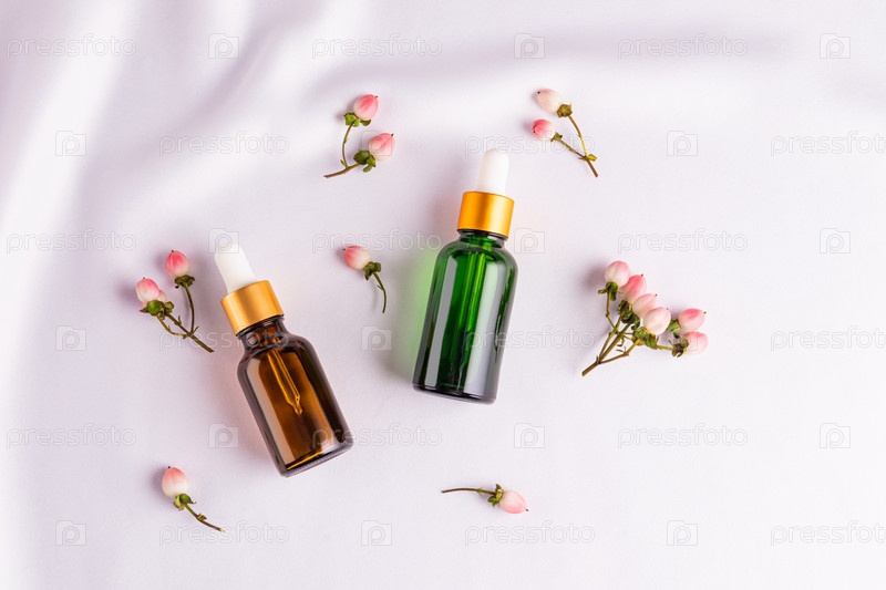 Две разные бутылки с капельницей с сывороткой или косметическим натуральным средством по уходу за лицом и телом на белом атласе среди декоративных ягод. Вид сверху