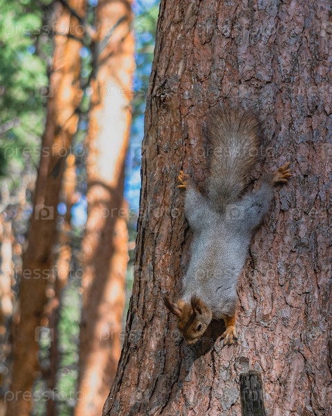 Лесная белка бегает и прыгает по деревьям в поисках еды