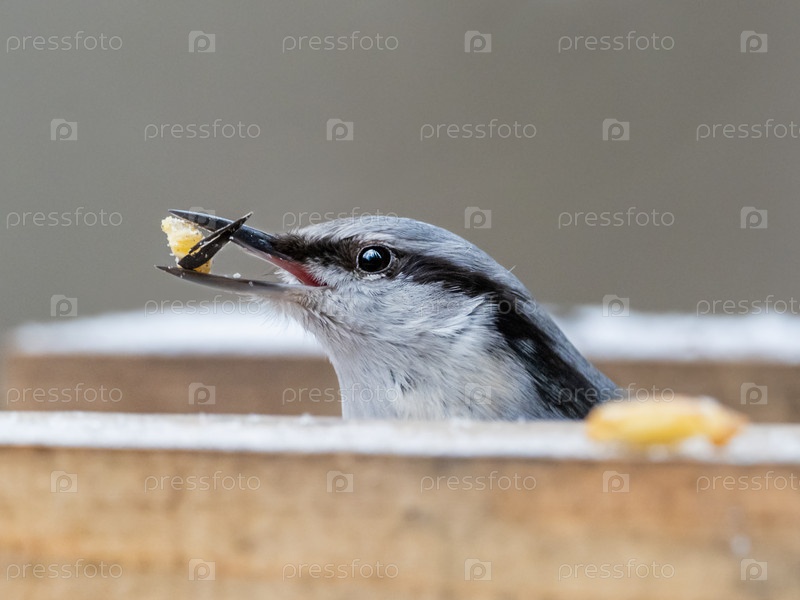 Евразийский ползучий или лесный ползучий.Sitta europaea, маленькая воробьиная птица, питается семенами из искусственного кормления для птиц.Зимний сезон