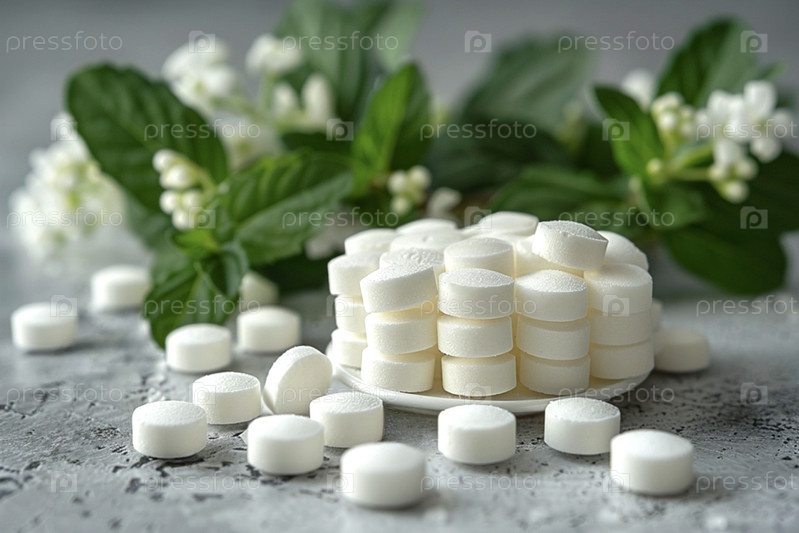 Таблетки стевии с искусственным подсластителем лежат на белой тарелке на светлом столе, а листья стевии не в фокусе на заднем плане
