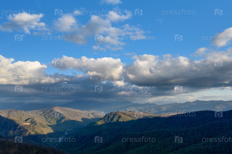 Белые кучевые облака над лесистыми горами