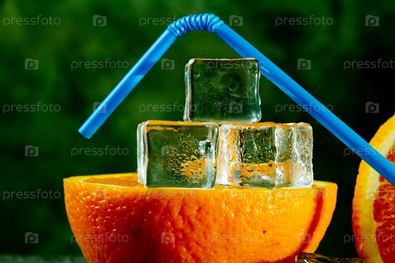 Апельсин с трубочкой для коктейлей. Ледяной апельсин. Сок со льдом