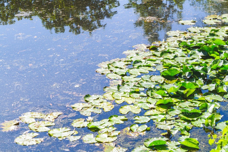 Старый пруд, заросший кувшинками и роголистником. Тихая заводь яркая