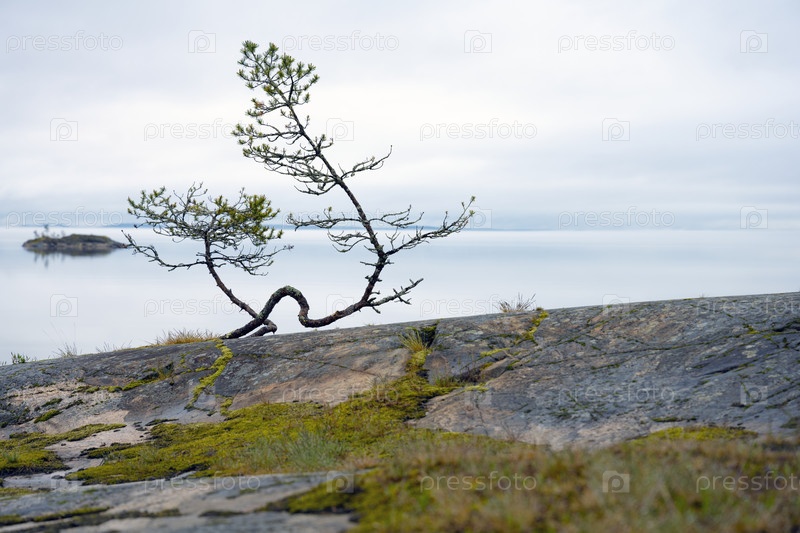 Одинокая сосна на скале на фоне туманного весеннего рассвета над Ладожским озером