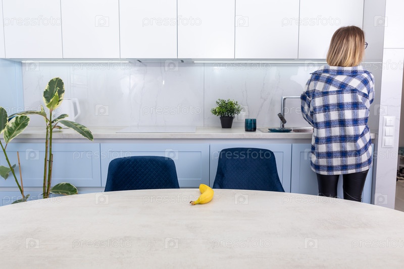 Домохозяйка стоит спиной к современной кухне